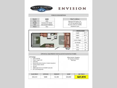 The Envision SVT travel trailers by Gulf Stream have got you covered when it comes to convenience, affordability, and comfort! Each model includes four manual stabilizer jacks, a friction hinge entry door, and deluxe slam-latch luggage doors so you can pack everything up quickly and easily. The fiberglass exterior sidewalls and one-piece vinyl roof create a lightweight trailer for easy towing, and each model comes standard with many safety features for your peace of mind. The included and required SVT Package features night shades, a power tongue jack, a tankless water heater, and an electric awning with LED lights and speakers to name a few stand-out features!