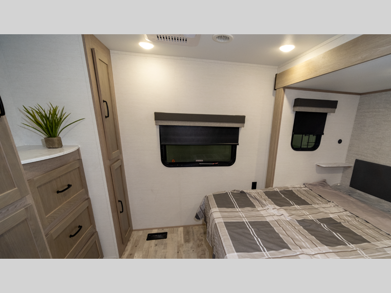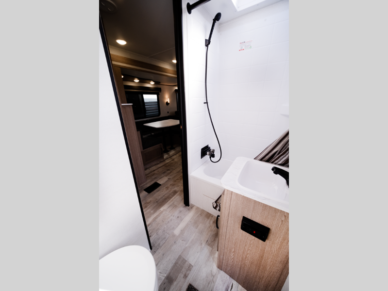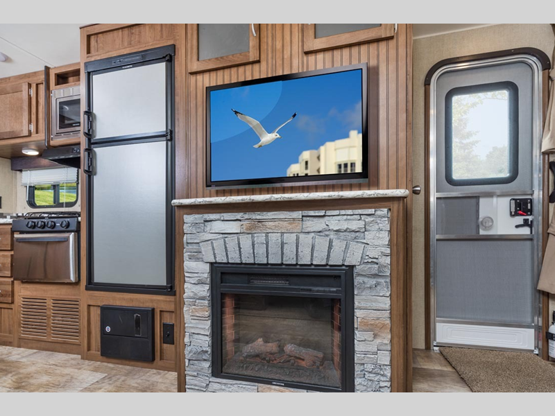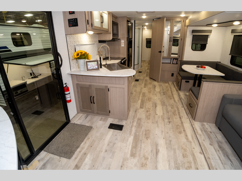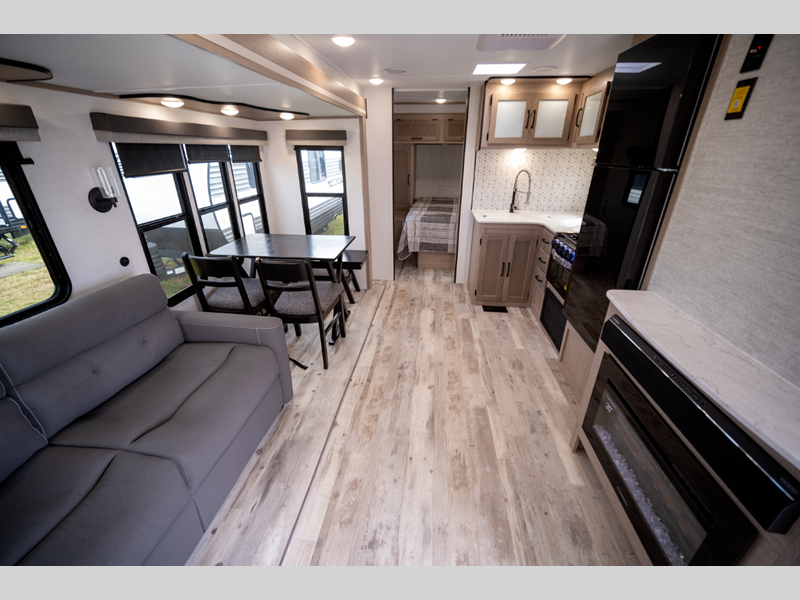 Sleeps 5 Slides 2 Length 33 ft 7 in Ext Width 8 ft Ext Height 11 ft 5 in Int Height 6 ft 8 in Hitch Weight 940 lbs Dry Weight 7390 lbs Cargo Capacity 2350 lbs Fresh Water Capacity 23 gals Grey Water Capacity 33 gals Black Water Capacity 33 gals Furnace BTU 35000 btu Available Beds Queen Refrigerator Type 12V Refrigerator Size 10.7 cu ft Cooktop Burners 3 Number of Awnings 1 LP Tank Capacity 20 lbs Water Heater Type Tankless AC BTU 13500 btu Awning Info Electric w/LED Lights Axle Count 2 Number of LP Tanks 2 Shower Type Standard Electrical Service 30 amp Similar Floorplans