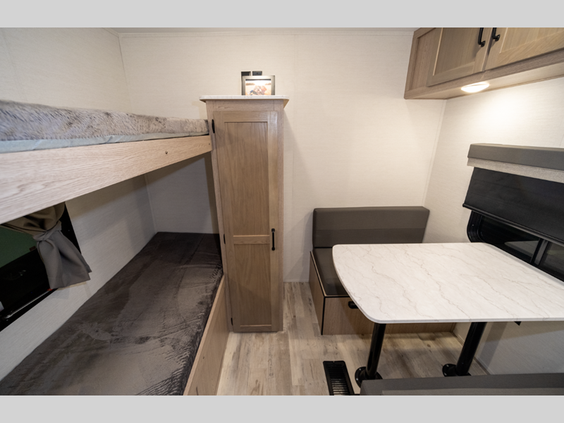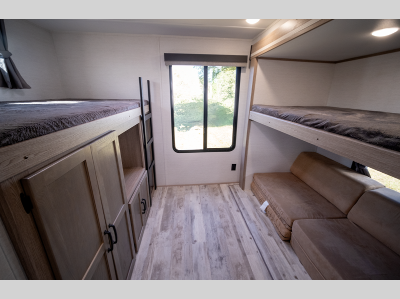 Sleeps 9 Slides 1 Length 36 ft 11 in Ext Width 8 ft Ext Height 11 ft 4 in Int Height 6 ft 8 in Hitch Weight 1010 lbs Dry Weight 7350 lbs Cargo Capacity 2460 lbs Fresh Water Capacity 35 gals Grey Water Capacity 33 gals Black Water Capacity 67 gals Furnace BTU 30000 btu Number Of Bunks 2 Available Beds King Refrigerator Type 12V Refrigerator Size 10.7 cu ft Cooktop Burners 3 Number of Awnings 1 LP Tank Capacity 20 lbs Water Heater Type Tankless AC BTU 13500 btu Awning Info Electric with LED Lights Axle Count 2 Number of LP Tanks 2 Shower Type Standard Electrical Service 30 amp Similar Floorplans