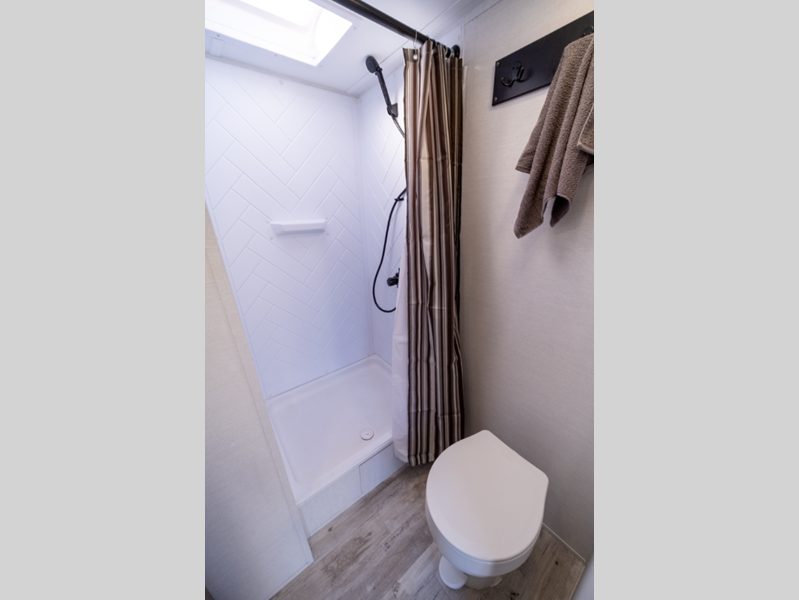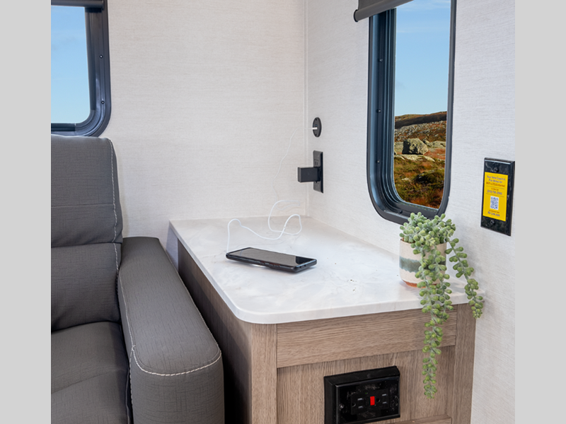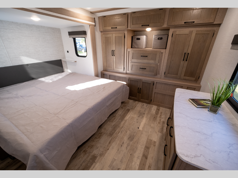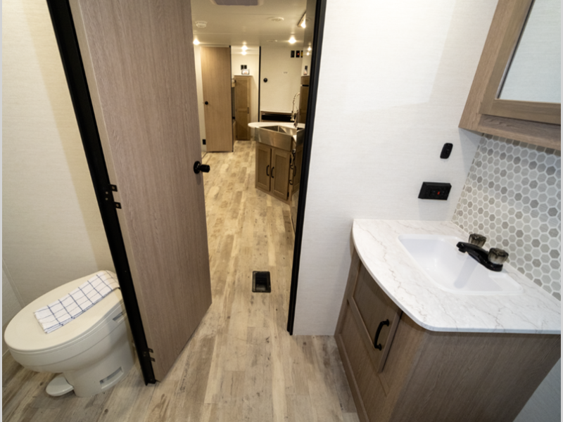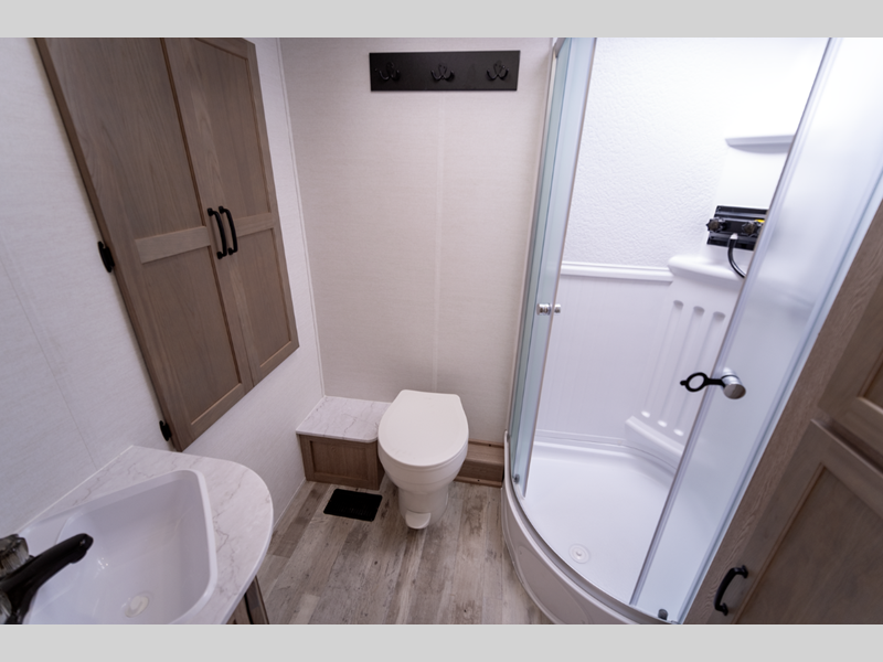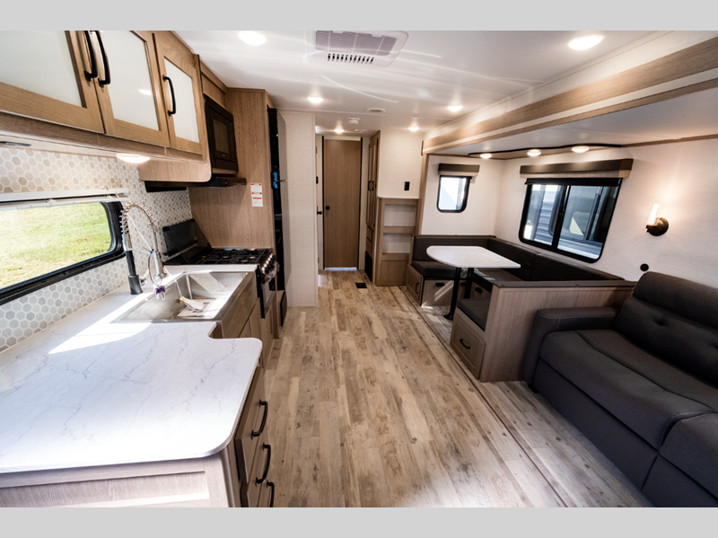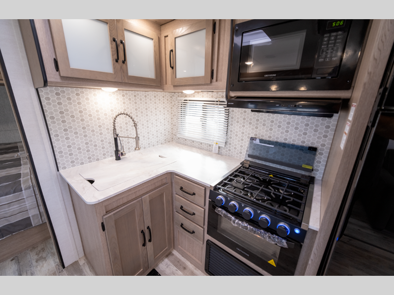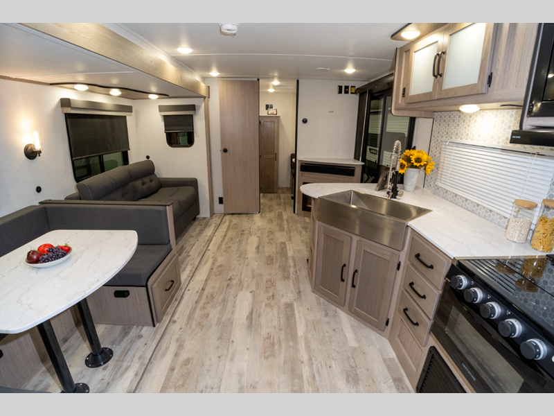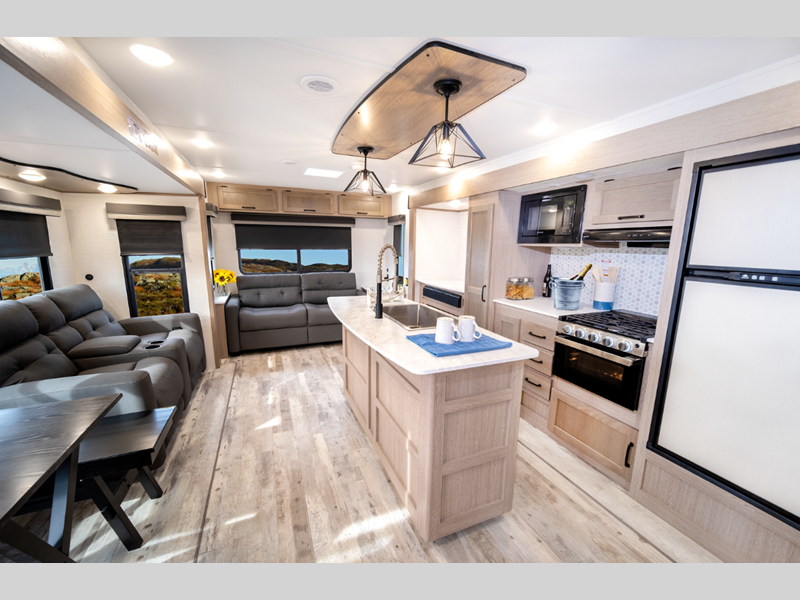 Each is built with a powder-coated steel l-beam frame with welded outriggers, a one-piece seamless roof to last for years, hand-cut and glued fiberglass insulation, and diamond plate on the lower front to protect again debris on the road. The interior offers handcrafted cabinetry with solid wood doors and drawers, stainless steel appliances, designer window treatments, and durable Hi-Performance vinyl flooring throughout, and more!