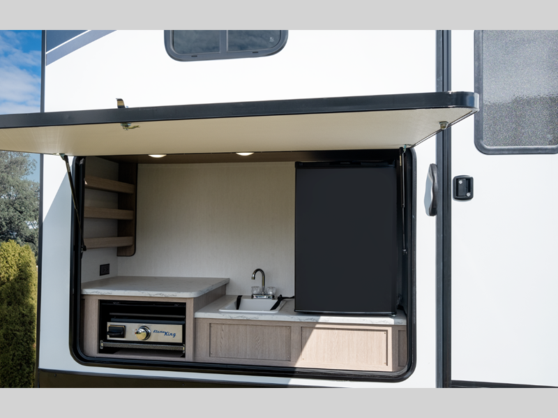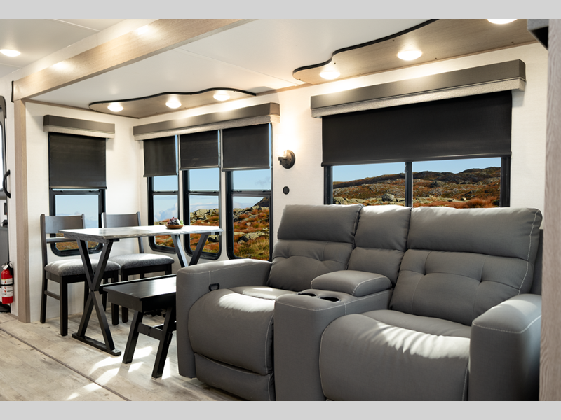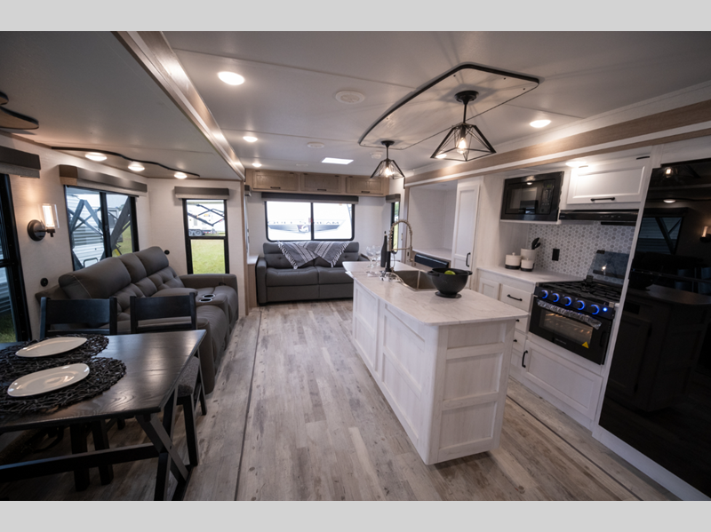Sleeps 5 Slides 2 Length 38 ft 4 in Ext Width 8 ft Ext Height 11 ft 3 in Int Height 6 ft 8 in Hitch Weight 1160 lbs Dry Weight 8480 lbs Cargo Capacity 1880 lbs Fresh Water Capacity 36 gals Grey Water Capacity 110 gals Black Water Capacity 37 gals Furnace BTU 30000 btu Available Beds King Refrigerator Type 12V Refrigerator Size 10.7 cu ft Cooktop Burners 3 Number of Awnings 1 LP Tank Capacity 20 lbs Water Heater Type Tankless AC BTU 13500 btu Awning Info Electric with LED Lights Axle Count 2 Number of LP Tanks 2 Shower Type Radius Electrical Service 30 amp Similar Floorplans