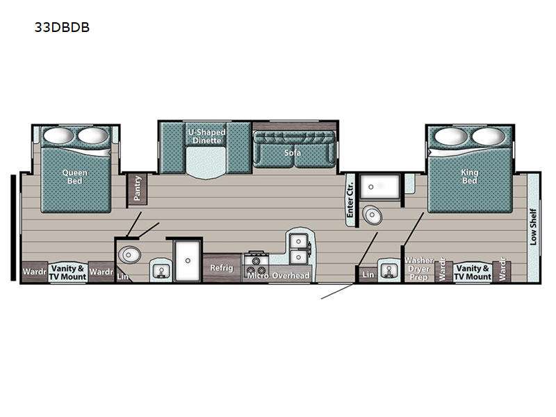 Sleeps 9 Slides 2 Length 33 ft Ext Width 8 ft Ext Height 10 ft 9 in Int Height 6 ft 8 in Hitch Weight 910 lbs Dry Weight 6660 lbs Cargo Capacity 1820 lbs Fresh Water Capacity 35 gals Grey Water Capacity 67 gals Black Water Capacity 33 gals Furnace BTU 30000 btu Number Of Bunks 2 Available Beds Queen Refrigerator Type 12V Refrigerator Size 10.7 cu ft Cooktop Burners 3 Number of Awnings 1 LP Tank Capacity 20 lbs Water Heater Type Tankless AC BTU 13500 btu Awning Info Electric w/LED Lights Axle Count 2 Number of LP Tanks 2 Shower Type Standard Electrical Service 30 amp Similar Floorplans