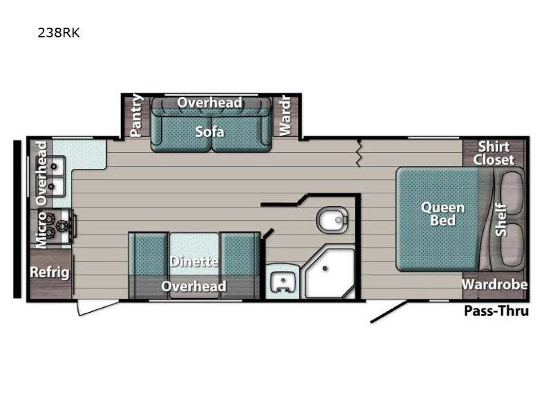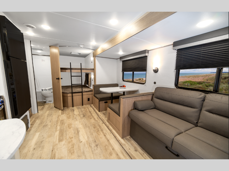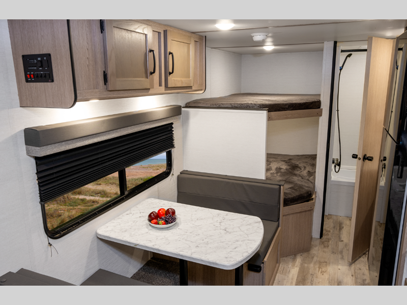 Sleeps 5 Slides 1 Length 23 ft 4 in Ext Width 8 ft Ext Height 10 ft 6 in Int Height 6 ft 8 in Hitch Weight 530 lbs Dry Weight 4430 lbs Cargo Capacity 1300 lbs Fresh Water Capacity 35 gals Grey Water Capacity 34 gals Black Water Capacity 34 gals Tire Size 14" Furnace BTU 20000 btu Number Of Bunks 2 Available Beds Queen Refrigerator Type Everchill Refrigerator/Freezer Refrigerator Size 10.7 cu ft Cooktop Burners 3 Number of Awnings 1 LP Tank Capacity 20 lbs Water Heater Type Tankless AC BTU 13500 btu Awning Info Electric w/LED Light Axle Count 2 Number of LP Tanks 2 Shower Type Tub/Shower Combo Electrical Service 30 amp Similar Floorplans
