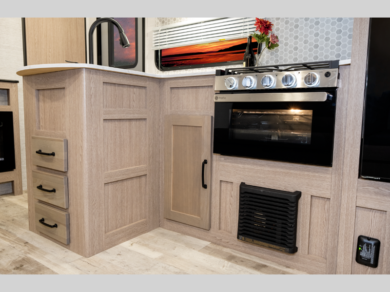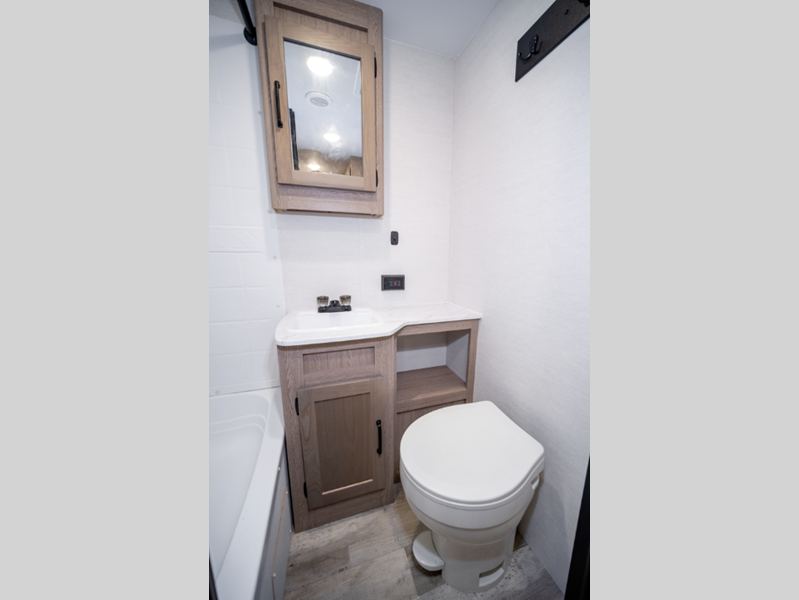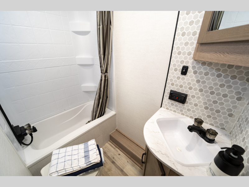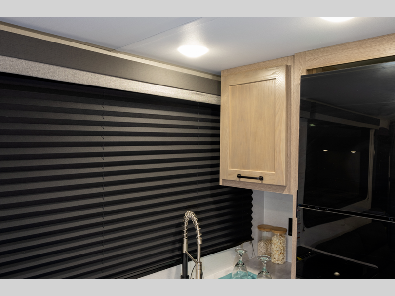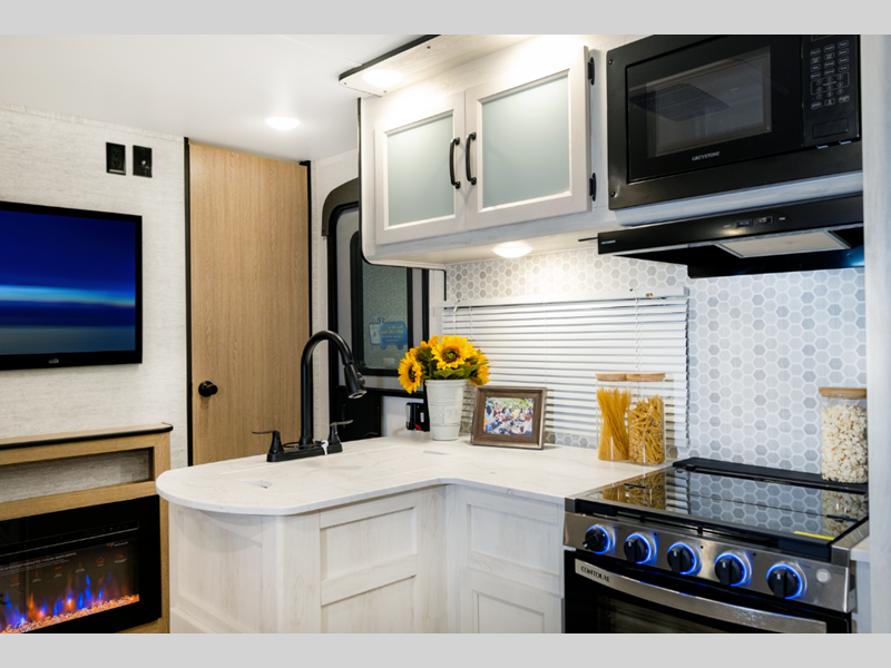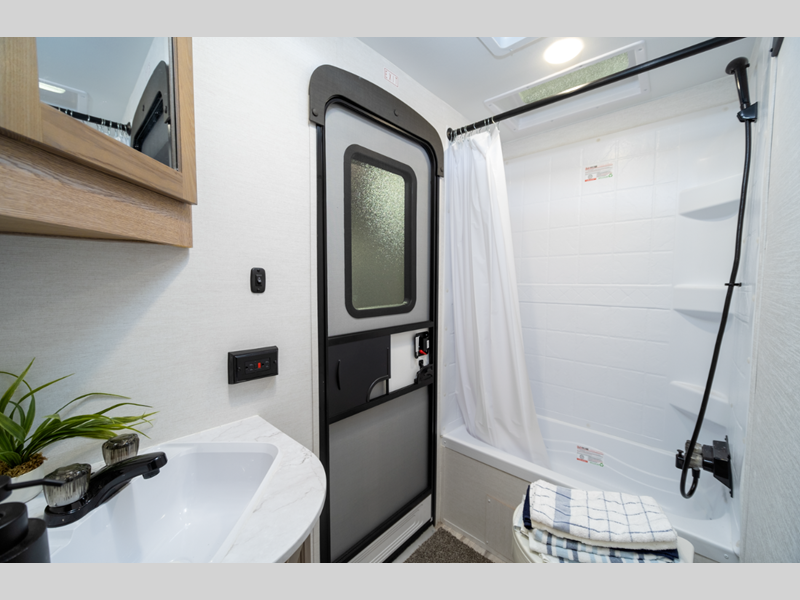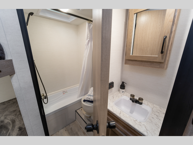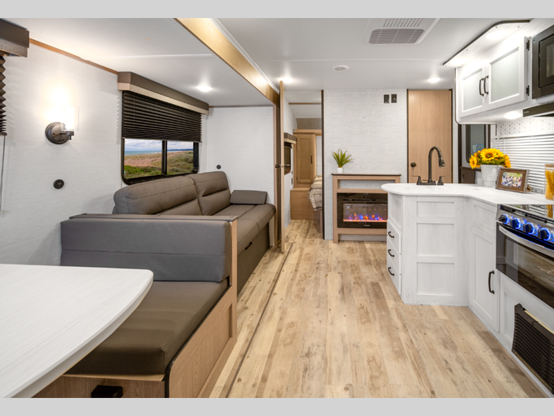 You'll instantly feel at home when you step inside to find craft-made cabinetry, high-performance vinyl flooring throughout, and a cozy queen bed. The 16,000 BTU gas furnace and fiberglass insulation will allow you to camp year around, and the 13,500 BTU A/C will be perfect for summer. . There is a pass-through storage on most models, plus a tankless water heater and many more conveniences.