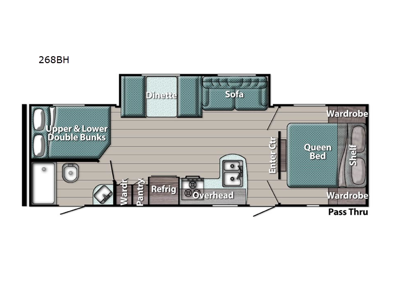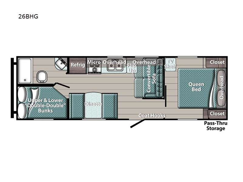 Sleeps 9 Slides 1 Length 29 ft 6 in Ext Width 8 ft Ext Height 11 ft 1 in Int Height 6 ft 8 in Hitch Weight 660 lbs Dry Weight 5177 lbs Cargo Capacity 2483 lbs Fresh Water Capacity 23 gals Grey Water Capacity 33 gals Black Water Capacity 34 gals Tire Size 14" Furnace BTU 20000 btu Number Of Bunks 2 Available Beds Queen Refrigerator Type Everchill Refrigerator/Freezer Refrigerator Size 10.7 cu ft Cooktop Burners 3 Number of Awnings 1 LP Tank Capacity 20 lbs Water Heater Type Tankless AC BTU 13500 btu Awning Info Electric w/LED Light Axle Count 2 Number of LP Tanks 2 Shower Type Tub/Shower Combo Electrical Service 30 amp Similar Floorplans