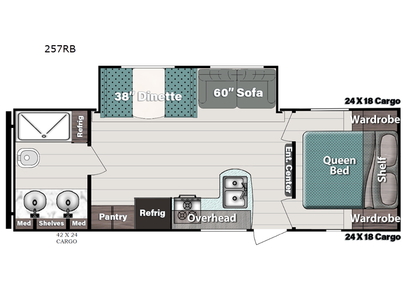 Sleeps 4 Slides 1 Length 26 ft 3 in Ext Width 8 ft Ext Height 11 ft 1 in Int Height 6 ft 8 in Hitch Weight 650 lbs Dry Weight 5250 lbs Cargo Capacity 2400 lbs Fresh Water Capacity 35 gals Grey Water Capacity 34 gals Black Water Capacity 34 gals Tire Size 14" Furnace BTU 20000 btu Available Beds Queen Refrigerator Type Everchill Refrigerator/Freezer Refrigerator Size 10.7 cu ft Cooktop Burners 3 Number of Awnings 1 LP Tank Capacity 20 lbs Water Heater Type Tankless AC BTU 13500 btu TV Info LR TV Awning Info Electric w/LED Light Axle Count 2 Number of LP Tanks 2 Shower Type Standard Electrical Service 30 amp Similar Floorplans