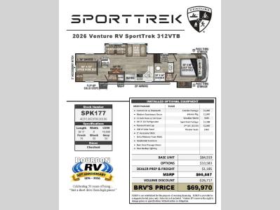Experience the luxury and practicality of Venture RV SportTrek at Bourbon RV in Bourbon, MO. These RVs are designed for those who love comfort and adventure, featuring expansive living spaces and cutting-edge amenities. Whether you're planning a short getaway or a long road trip, SportTrek has you covered. With a wide range of floorplans, including features like outdoor kitchens and lightweight construction for easier towing, the SportTrek is perfect for families and adventure seekers. Proudly serving the Bourbon area and surrounding regions, we invite you to explore our inventory. Reach out via our contact us page or call 573-732-5100 for assistance.