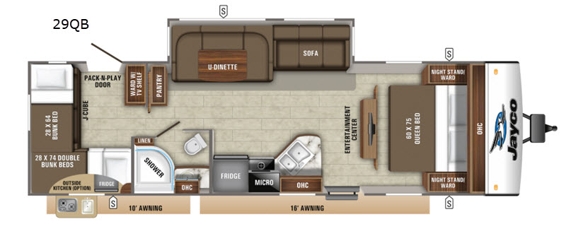 Load up the whole family for a weekend of campfires, bike riding, horseshoes and more! Imagine the kids falling right to sleep in the private bunkhouse after removing the extra camp gear through the handy Pack-n-Play door. The J-cube sofa and triple bunks will surely be a fun place to sleep. You will have your own walk-around queen bed and privacy on the opposite side of the trailer, and everyone can share the main living area when watching the LED TV. The U-shaped dinette and sofa offer a great place to eat, visit and sleep if needed. And the 10' and 16' power awnings provide protection from the elements, and the outside kitchen gives you another space to make meals when you aren't using the full kitchen inside.